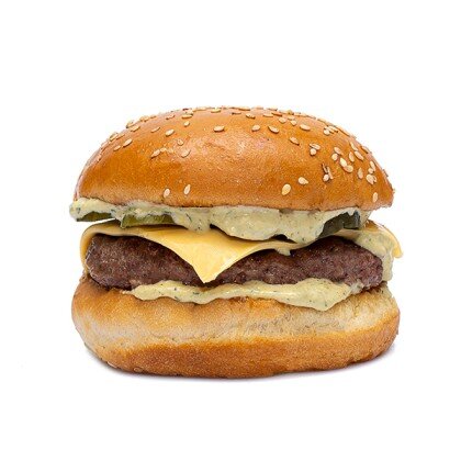 Булочка, Лосось филе, свежий огурец, лист салата, ялтинский лук, соус ранч, соус бургер