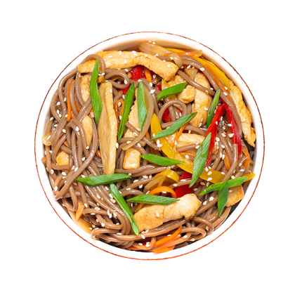 лапша гречневая, курица, болгарский перец, морковь, лук, азиатский соус, кунжут