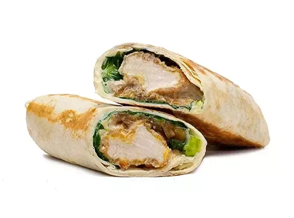 пшеничная лепешка, курица в панировке, соус сливочный, соус блю чиз, салат романо, сыр чеддер, кармелизированный лук