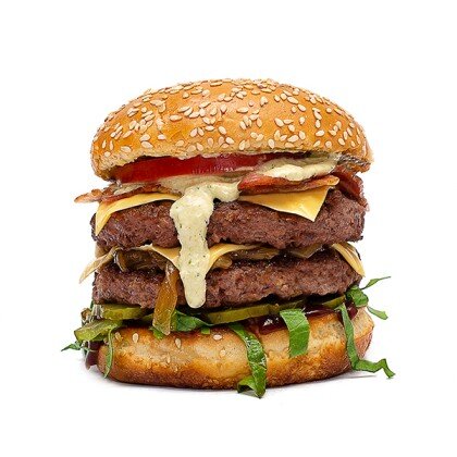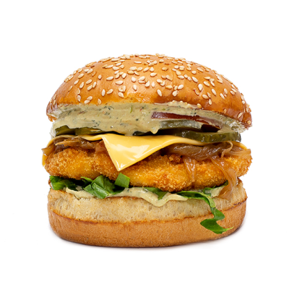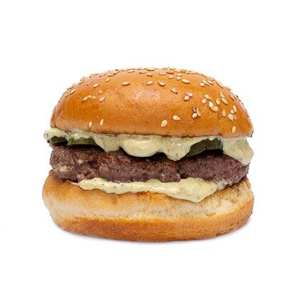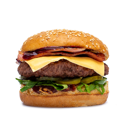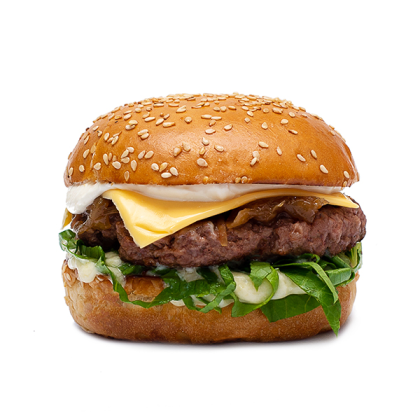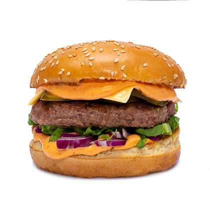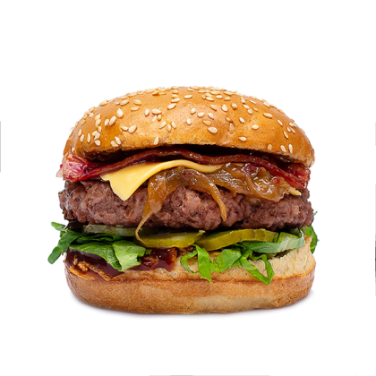 булочка, фарш из мраморной говядины, маринованные огурцы, соус бургерный, сыр чеддер
