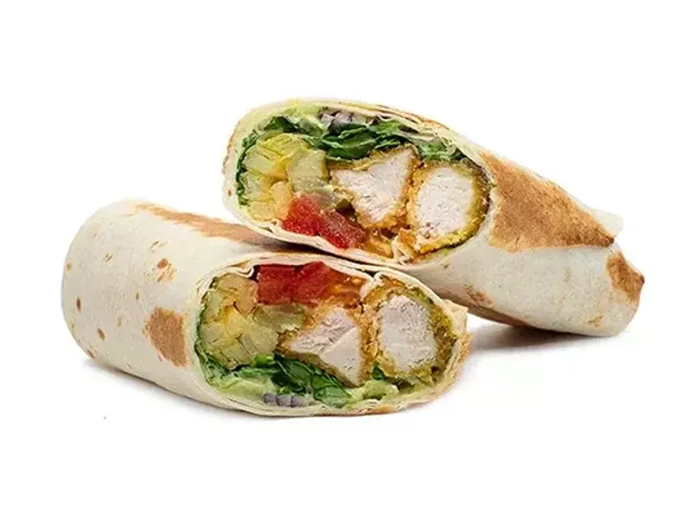 пшеничная лепешка, курица в панировке, картофель фри, соус ранч, помидор, лук, салат романо, маринованный огурец